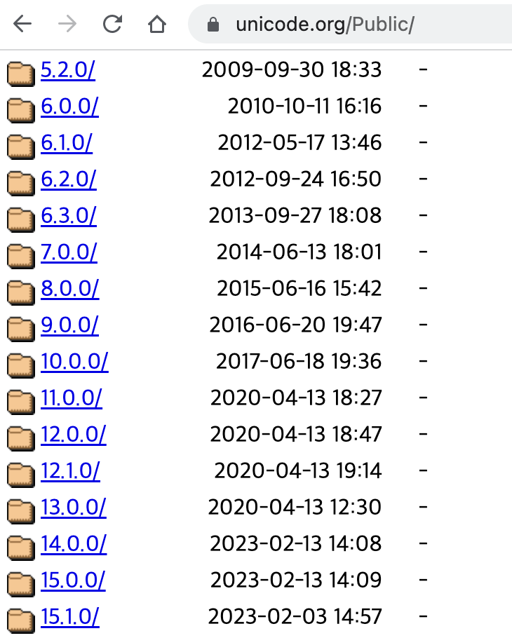 이모지는 unicode.org(https://home.unicode.org/)에서 관리한다. 이모지도 문자라 유니코드로 되어있기 때문이다. 2023년 4월 기준으로 3,664개가 등록되어있고, https://unicode.org/emoji/charts/emoji-counts.html 여기서 확인 가능하다. 신규 이모지는 unicode.org에 신청(2024년 4월에 재오픈한다고 함)하고 심사 통과되면 등록된다. 이 때 등록된 이모지와 여러 문자들이 유니코드 버전과 함께 배포된다. https://unicode.org/Public/ 여기에서 유니코드 배포 이력을 확인 할 수 있고 현재 최신은 15버전이다.