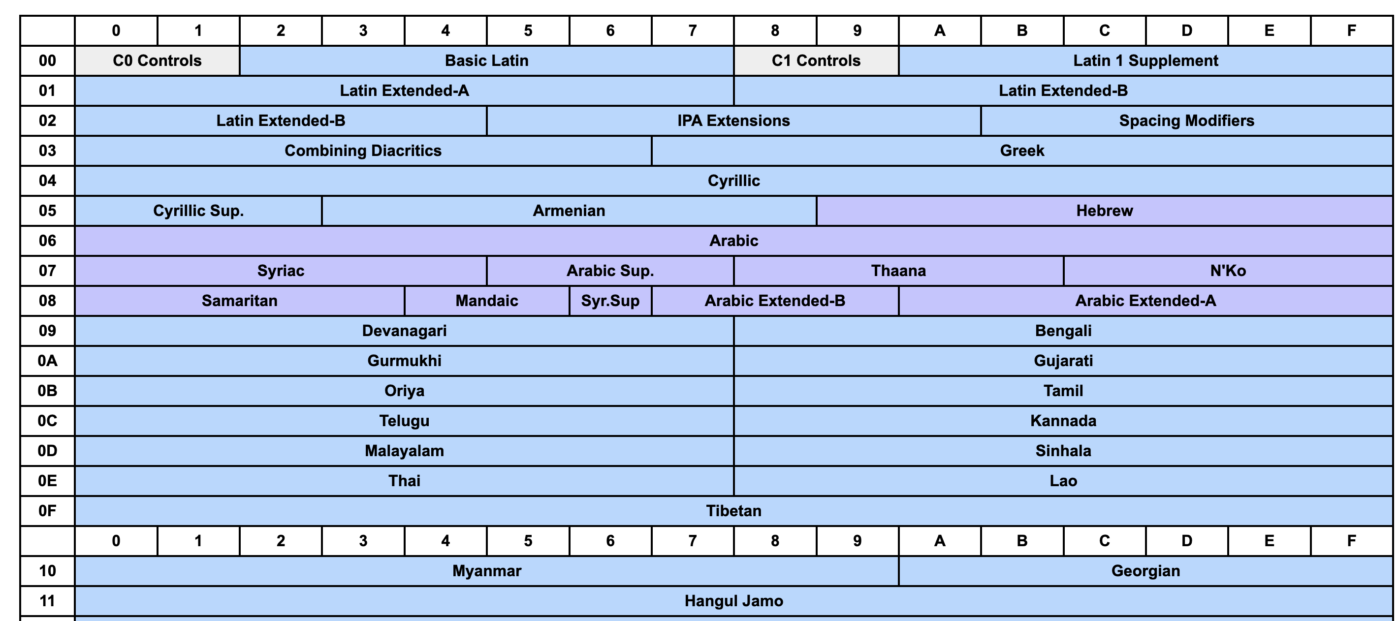 가로축과 세로축을 조합해 하나의 코드로 찾아가기 위한 좌표계 정도로 이해하면 된다. 유니코드 전체를 논리적으로 나눈 구획을 말하며 0번(다국어 기본 평면)에서부터 16번까지 모두 17개로 나뉘고, 각 평면은 65,536(2의 16승)개의 코드로 구성된다. 모두 다 알 필요는 없고 기본 평면과 보조 평면 2개만 알면 된다.