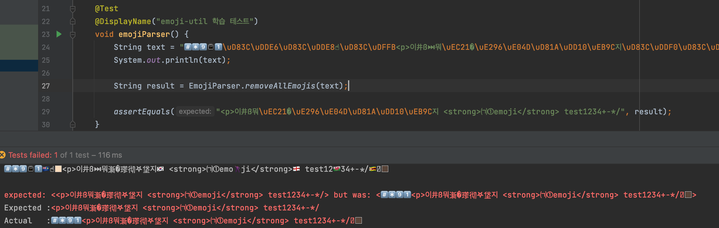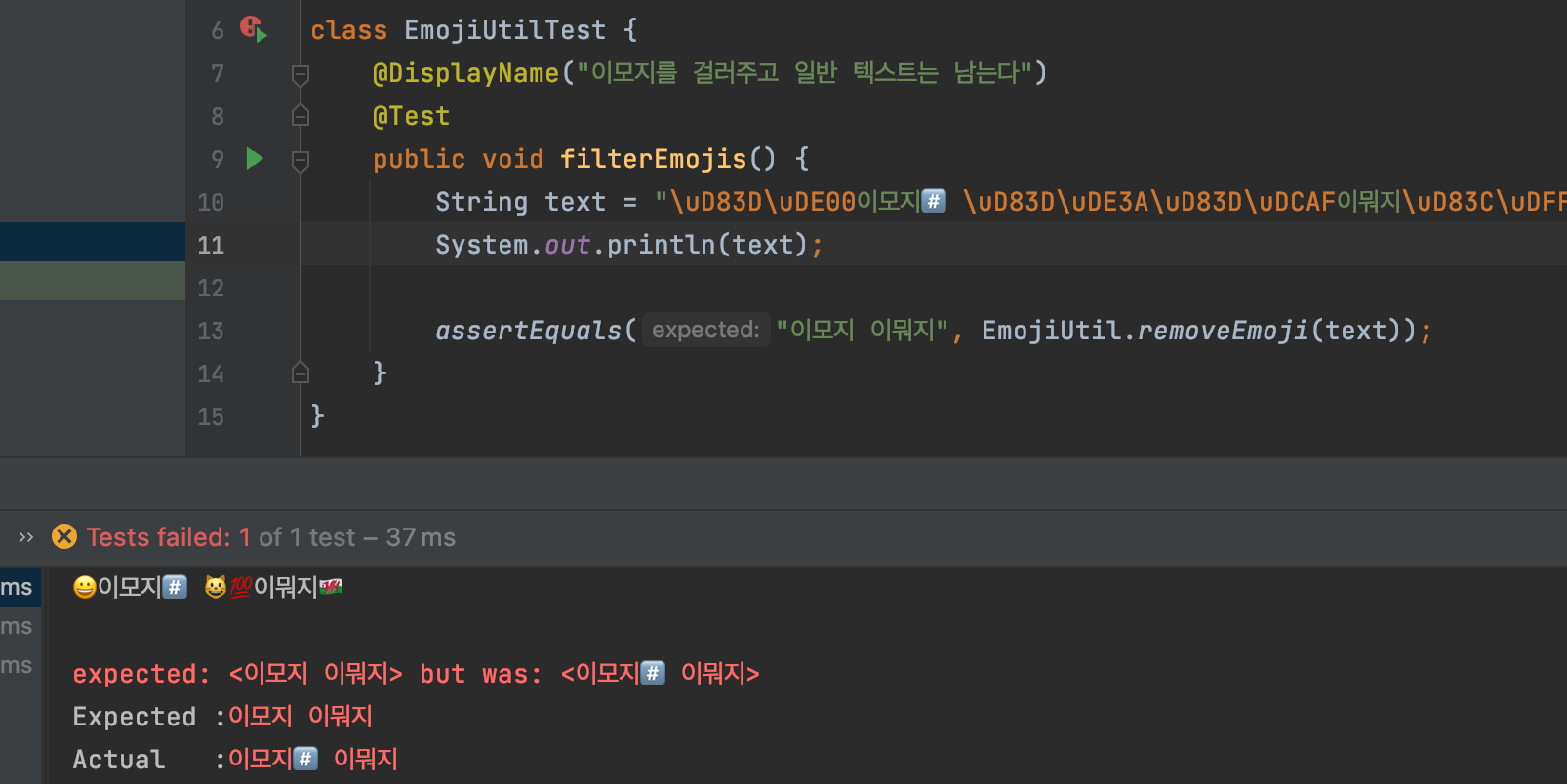 @DisplayName("모든 이모지에 대해 제거 여부를 테스트한다.")